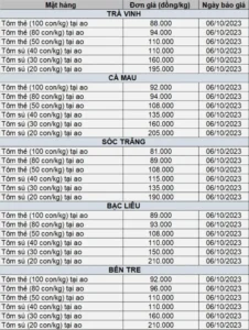 Bảng giá tôm nguyên liệu tuần 02/10 – 06/9/2023