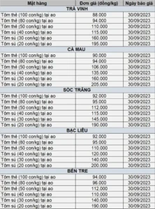 Bảng giá tôm nguyên liệu tuần 25/9 – 29/9/2023