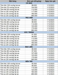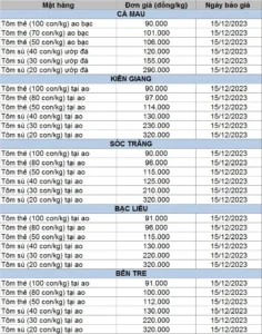 Bảng giá tôm nguyên liệu tuần 4/12 – 8/12/2023